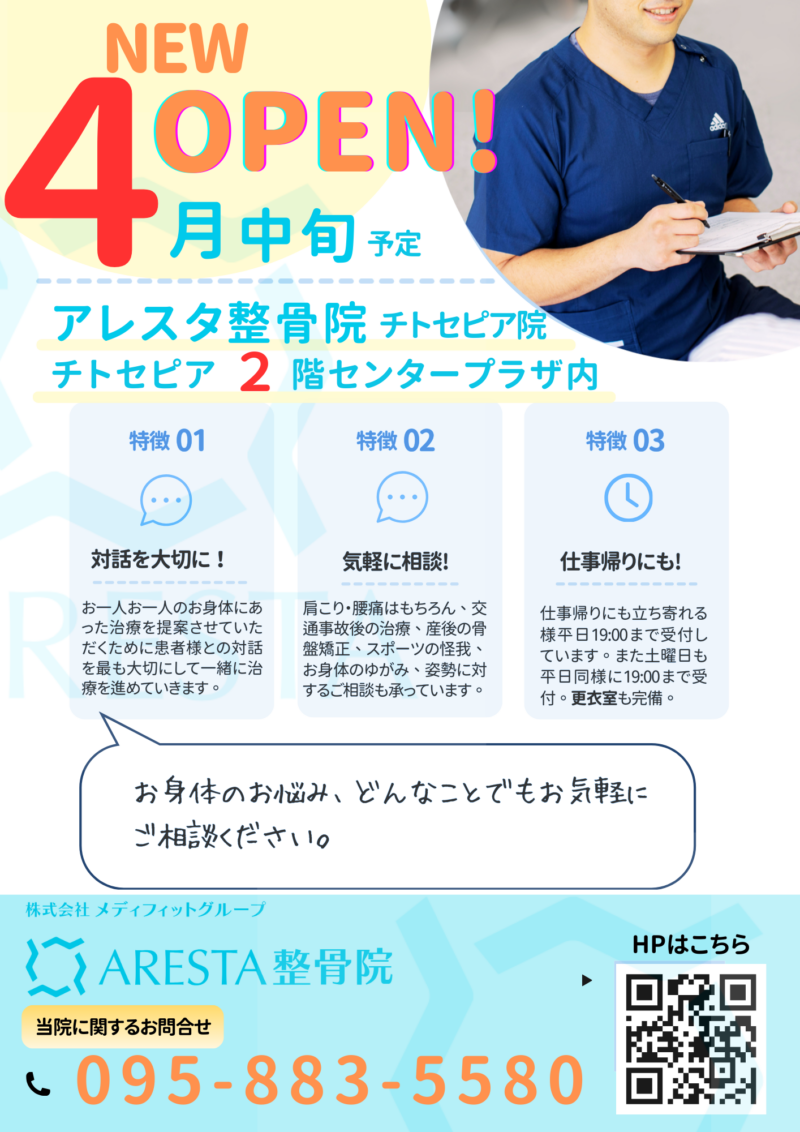 この度、長崎市千歳町チトセピア2FにARESTA(アレスタ)整骨院チトセピア院を開設する運びとなりました。これもひとえに、日頃より支えてくださっている皆様のおかげと心より感謝申し上げます。